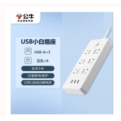 公牛(BULL)超功率保护 新国标公牛小白USB插座/插线板 GNV-UUN153 3usb接口 6孔全长5米