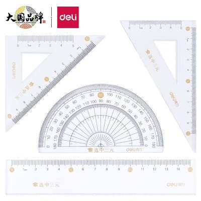 首页 > 办公用品 > 文具 > 得力(deli)71950 连中三元绘图制图考试套尺 直尺三角尺量角器4件套15cm经典4件套