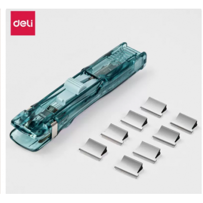 得力(deli)装订推夹器 学生办公便携装订器 可夹纸张数55张 透明蓝 8597 1推夫器配8补充夹