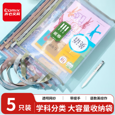 齐心 5个装a4学科分类可手提文件袋小学生拉链袋 作业科目收纳袋套装