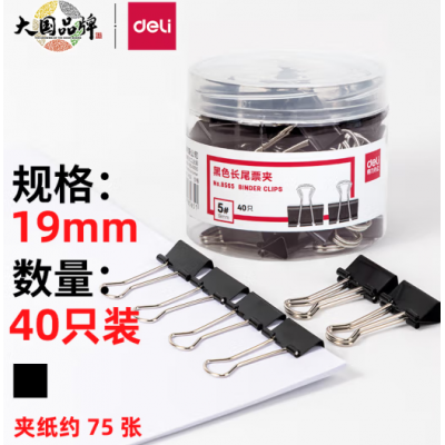得力(deli)长尾夹40只19mm黑色长尾夹票夹 金属燕尾夹票据夹子 办公用品 小号长尾夹8565