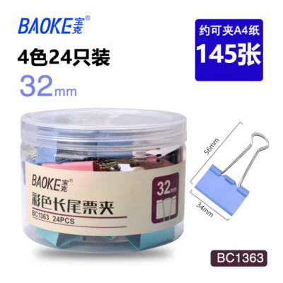 宝克长尾夹大号文件夹凤尾夹彩色文具燕尾夹中号混装小夹子小号铁票夹票据金属书夹子混办公用品 彩色32mm24个装