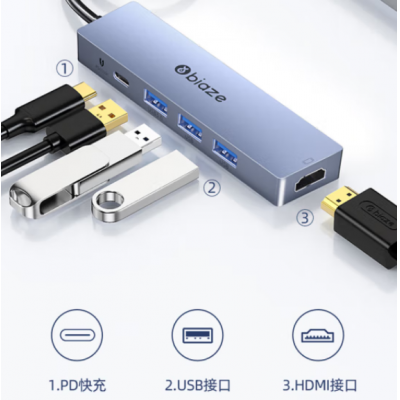 毕亚兹 Type-C扩展坞 USB-C转HDMI转接头4K投屏PD充电 R53-5口