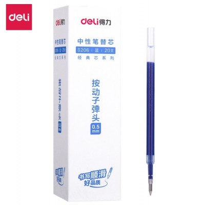 得力S206中性笔替芯0.5mm按动子弹头(蓝)(20支/盒)