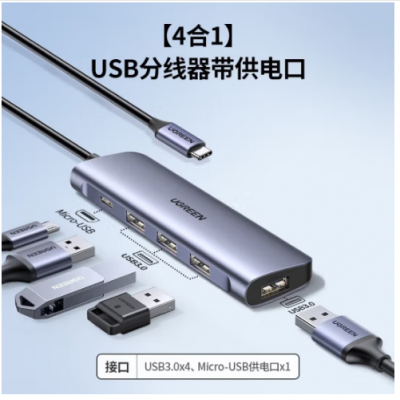 拓展坞typec分线器电脑转接头usb扩展器 pro转换器air雷电4hdmi投影 (4合1)USB3.0x4+Micro-USB供电 0.12m