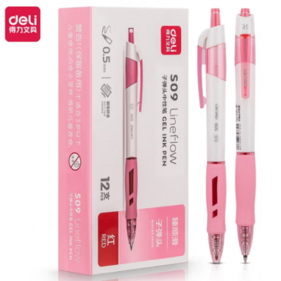 得力(deli)【顺滑之星】中性笔 臻顺滑按动中性笔 签字笔 时尚办公中性签字笔 0.5mm子弹头中性笔 12支/盒S09红色签字笔